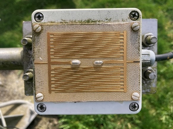 Dans le cadre des avertissements maladie, un facteur important est la présence de gouttes d'eau sur les feuilles des plants de pomme de terre. Pour apporter cette information, les stations sont équipées de capteur d'humidité de surface ( ou d'humectation), le modèle SKLW 1900 du fabricant Skye. (https://www.skyeinstruments.com/surface-wetness-sensor/) Ce capteur est un boîtier étanche à l'eau et recouvert d'une grille sensible plaquée or, simulant le comportement d'une feuille. Le principe de fonctionnement de l'humectomètre se base sur la grille de détection qui est excitée par une tension alternative et les gouttes d'eau à sa surface. La présence d'eau, que ce soient des gouttes ou des fines gouttelettes, modifie l'impédance (résistance totale que présente le câble au courant électrique qui le traverse) de la grille. Les valeurs standards de sortie du capteur sont comprises entre 0 et 1V, où 0V correspond à une surface sèche et 1V à une surface humide. |