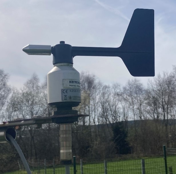 Le suivi de la vitesse du vent se fait à l'aide d'un anémomètre à coupelles, le modèle A100R du fabricant Vector Instruments. La prise de mesure de la vitesse du vent provient d'un aimant situé à l'ntérieur de l'anémomètre qui permet à un interrupteur à lames souples d'établir et de rompre le contact une fois par révolution du rotor. (http://www.windspeed.co.uk/ws/index.php?option=displaypage&Itemid=67&op=page&SubMenu) |